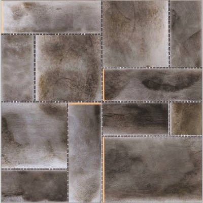 La collezione composta da superfici di alluminio graffiate e ossidate, si impone per le ardite lavorazioni manuali che danno vita a inusuali tramature dai toni caldi. I mosaici e il dinamismo della altre superfici consentono di vestire gli spazi dell’abitare con il mood che più si addice alla propria personalità, per creare uno stile unico.